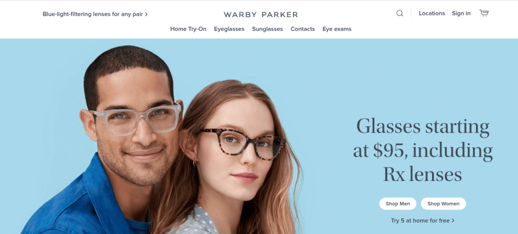 Warby Parker’s landing page clearly conveys their main product - prescription eyeglasses starting at only $95 - along with large images of their actual product. This is effective communication of their unique selling proposition - stylish glasses at an affordable price.