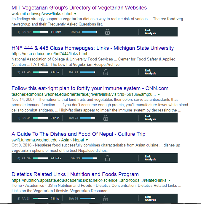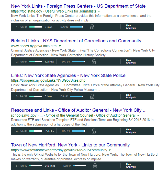 Jeg fik disse resultater. Med MozBar-udvidelsen tændt, kan du nemt finde dine bedste leads. Du kan se, at der er nogle autoritative sider med gode DA- og PA-scorer.