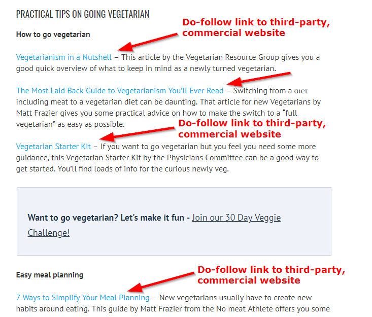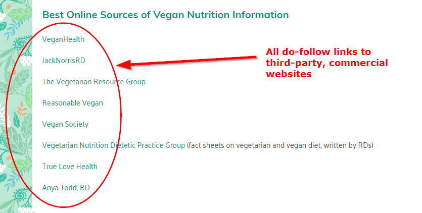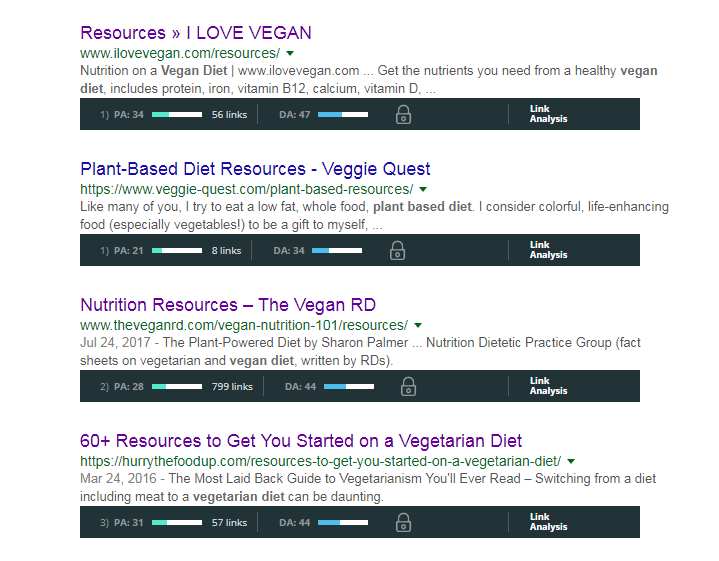 Når du forsker, skal du ikke vende det blinde øje til ressourcesider, der ikke præcist er kun-links sider. Her er et eksempel fra den "veganske kost" søgning.