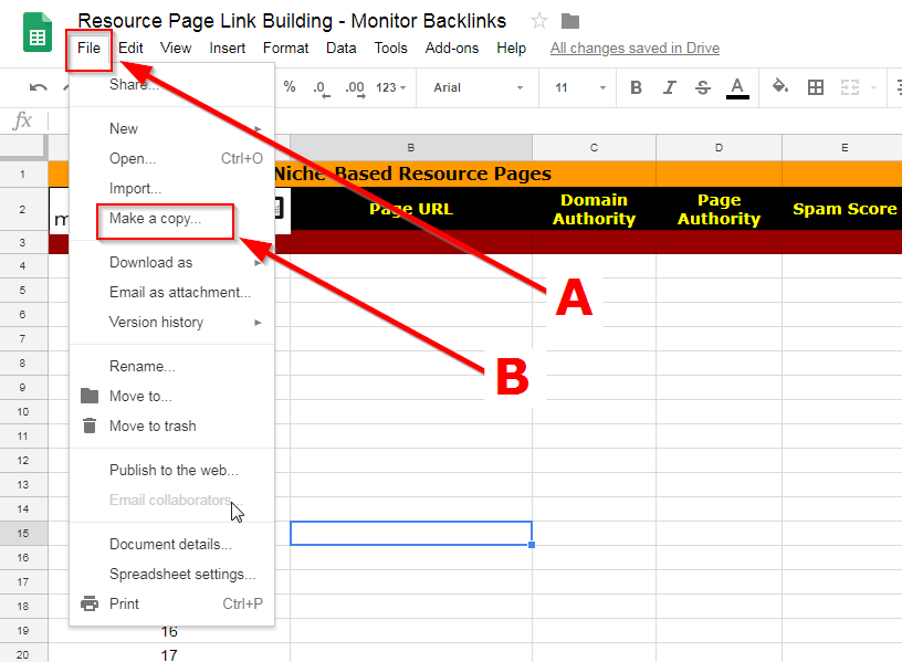 Du kan lave en kopi til dig selv. Klik bare på "File" og derefter "Make a copy," som vist på billedet nedenfor.