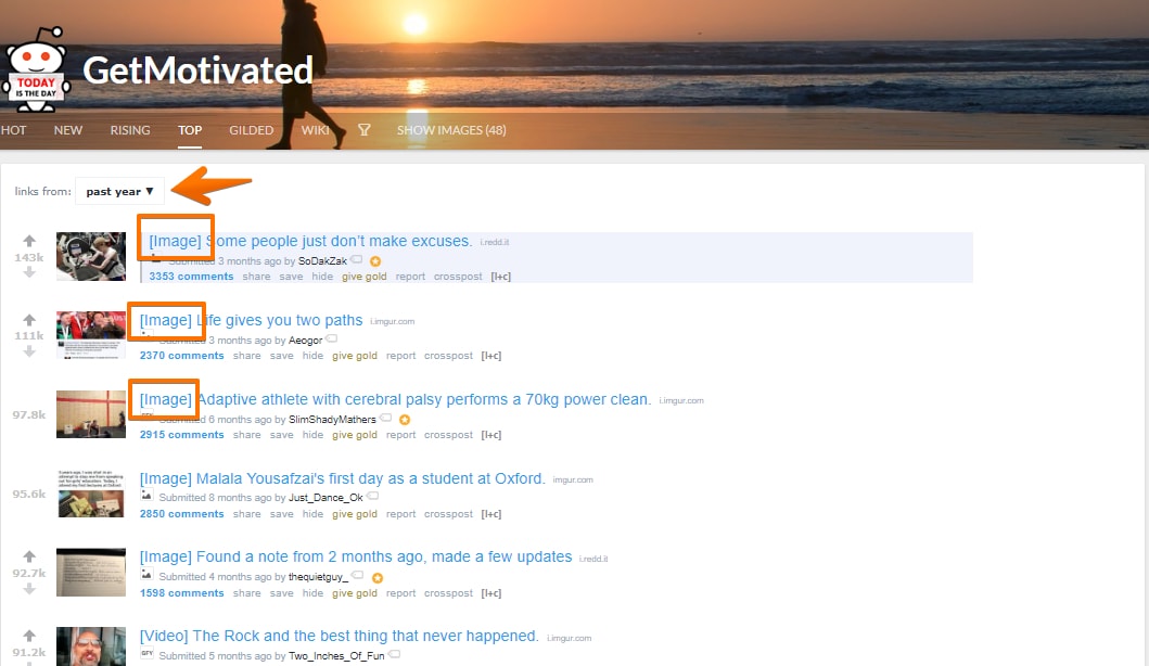 Ingen to subreddits vil være ens i deres præferencer. For eksempel, på r/getmotivated, vil du se, at billedindhold er elsket af publikum.