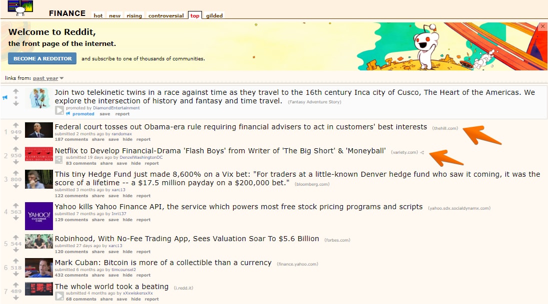 Men på r/finance, bemærk hvordan de øverste opslag er links til interessant indhold hostet på websites uden for Reddit.