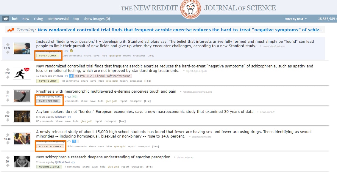 En anden trick er at bruge tags (svarende til hashtags på Instagram og Twitter). På Reddit er tags defineret som ord eller kategorier inden for firkantede parenteser eller knaplignende bokse. Her er nogle eksempler på de tags, der bruges på r/science: