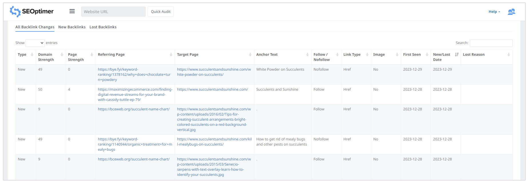 SEOptimer suit automatiquement les activités de création de liens de vos concurrents et vous montre tous les liens qu'ils ont reçus, dans une liste similaire à la vôtre :