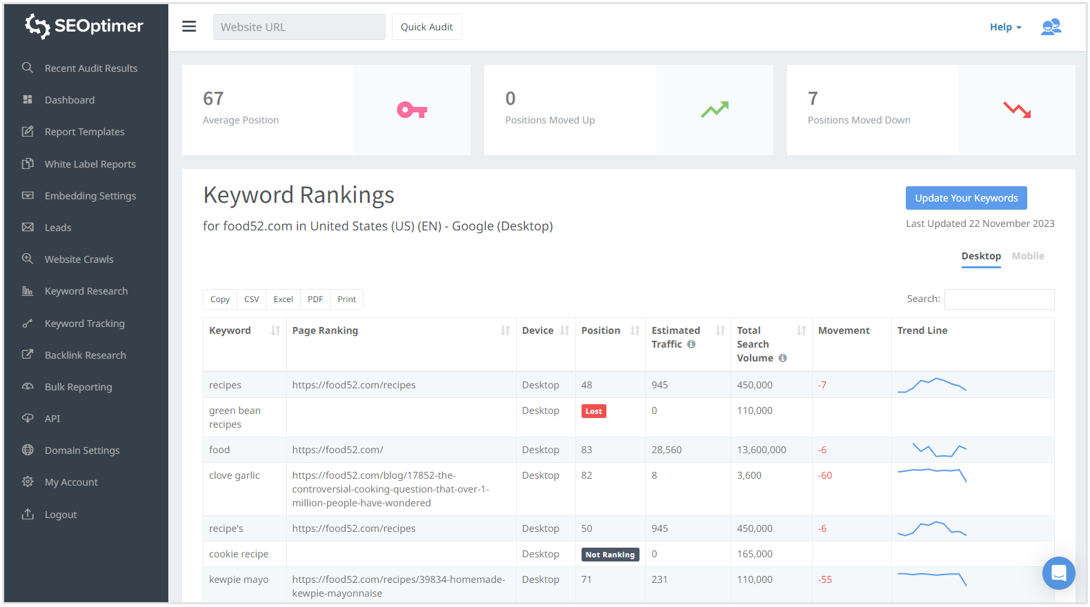 Si vous avez un compte SEOptimer, vous pouvez consulter votre liste de mots-clés pour identifier facilement ceux pour lesquels vous vous en sortez déjà bien et ceux qui nécessitent plus d'attention.