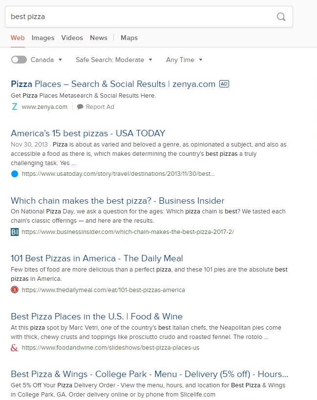 In de screenshots hieronder kun je het verschil zien in de zoekresultaten wanneer je geografische trefwoorden toevoegt en verwijdert aan de zoekzin "beste pizza."