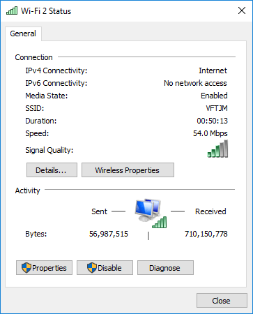 - Wifi bağlantınıza tıklayın. ‘Wifi Durumu’nu gösteren yeni bir pencere açılır. Burada ipv4 ve ipv6 bağlantınızı, hızınızı ve internet kalitenizi aşağıda gösterildiği gibi görebilirsiniz: