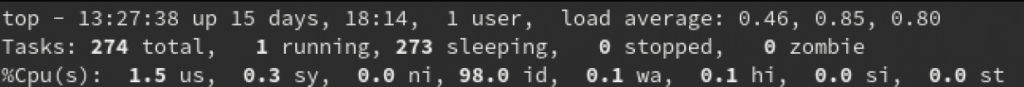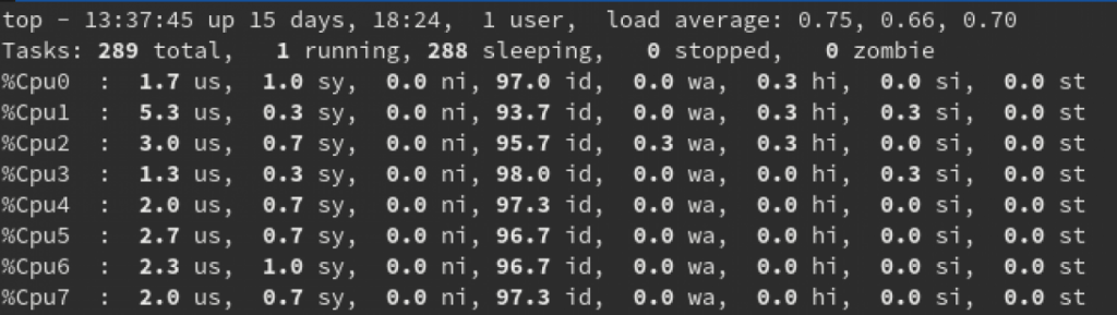 Daha sonra CPU kullanımını kontrol etmek için top yardımcı aracını kullanabilirsiniz. Buna benzer bir şey görmelisiniz: