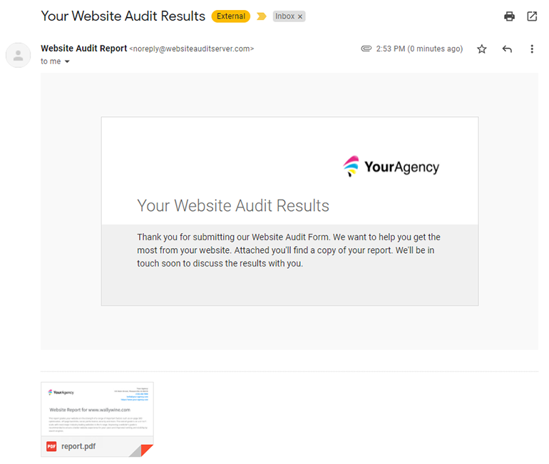 I'm doing a test using the URL "https://www.wallywine.com/" and I've put my SEOptimer email address in to simulate what the client experience is like. In my Embedding Settings in SEOptimer I ticked to send the client an email and added my "YourAgency" logo to the email.