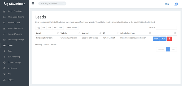 Also, the new lead immediately landed in the "Leads" tab of SEOptimer: