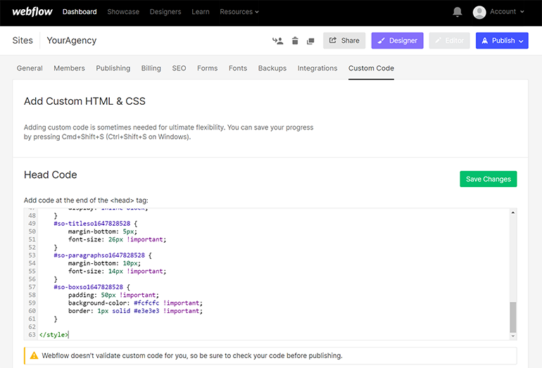 Now click the top-left 'W' button and select 'Project Settings' and then click 'Custom Code' in the sub-menu. Paste the code into the 'Head Code' box (Ctrl + V / Command + V) and click the green 'Save Changes' button: