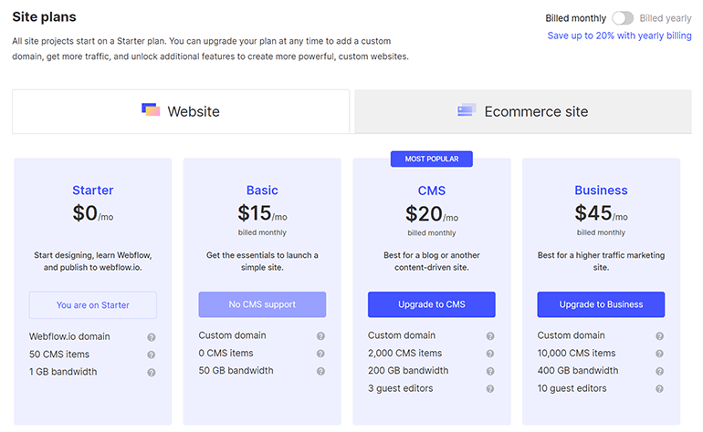 The embed functionality is what Webflow calls "Custom Code" which is only available on their paid site plans. If you're already on Webflow's Basic plan, Custom Code is included in this plan so you won't need to change your plan. However if you have a free Webflow site with a blog, you'll need to move up to Webflow's CMS plan which enables the Custom Code feature (or if you have a Webflow site without a blog, the Basic plan will be sufficient!). These plan details were accurate at the time of writing, so please check Webflow's pricing page for their latest plans, pricing and features.