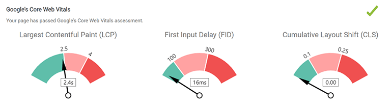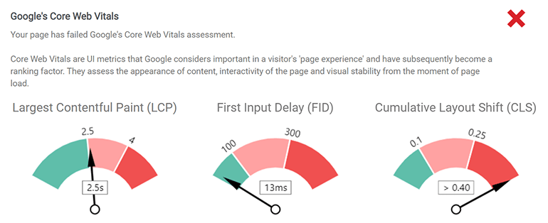 The actual check itself contains all 3 CWV metrics within the "Usability" section of the report. The audit returns the exact metric value displayed in SEOptimer's familiar dials (similar to the dials we use further down in the "Performance" section of the report).