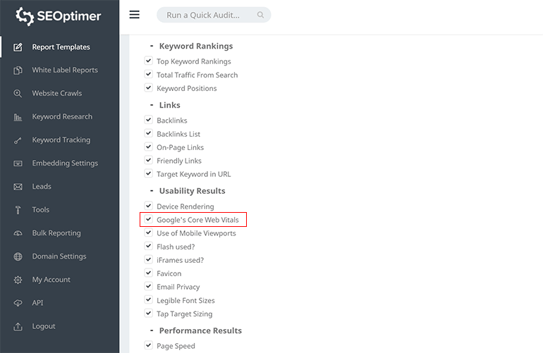 SEOptimer's Core Web Vitals checks are available in all standard and White Label Reports. The checks are automatically enabled on all existing White Label Report templates too.