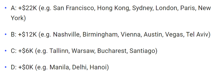 Pre-pandemic, some remote companies like Buffer added location top-ups based on where their employees live to factor in higher cost of living. They grouped cities of all their employees into 4 distinct groups that added an additional location amount to their annual salary package - not that Group D received zero additional in their salary: